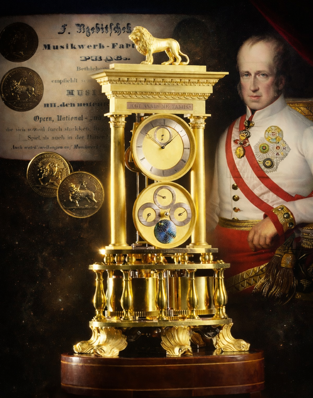 Unikátní a mimořádně významné stolní astronomické hodiny s ročním nátahem a opakovacím čtvrťovým bicím mechanismem Výrobce: firma FRANZ RZEBITSCHEK IN PRAG Hodinář: Franz Rzebitschek (narozen 26