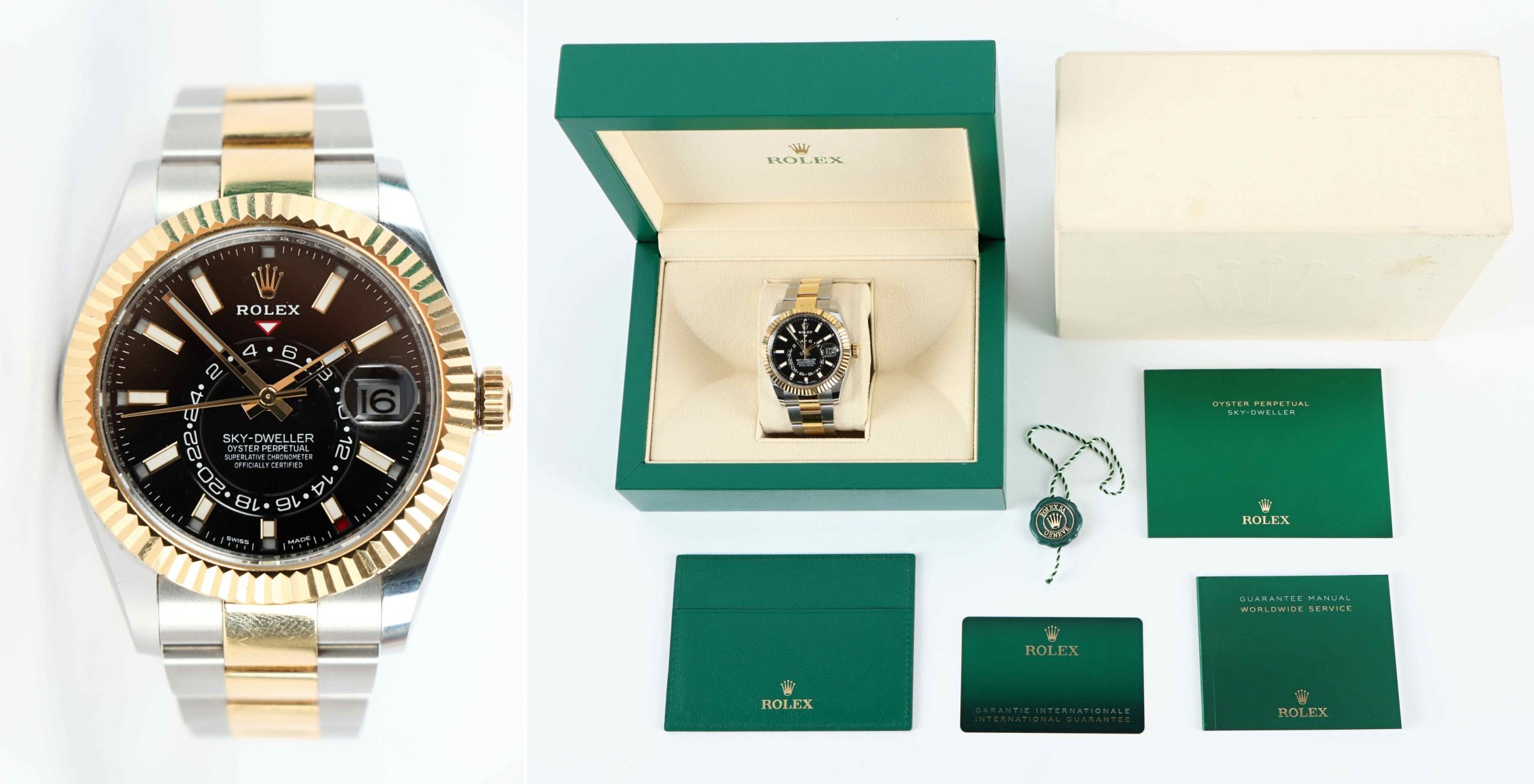 Švýcarsko, Rolex, vyrobeno okolo roku 2021, pánské náramkové hodinky Rolex Sky-Dweller, automat, průměr hodinek 42 mm, pouzdro i tah vyrobeno ze zlata a oceli, černý číselník, safíro