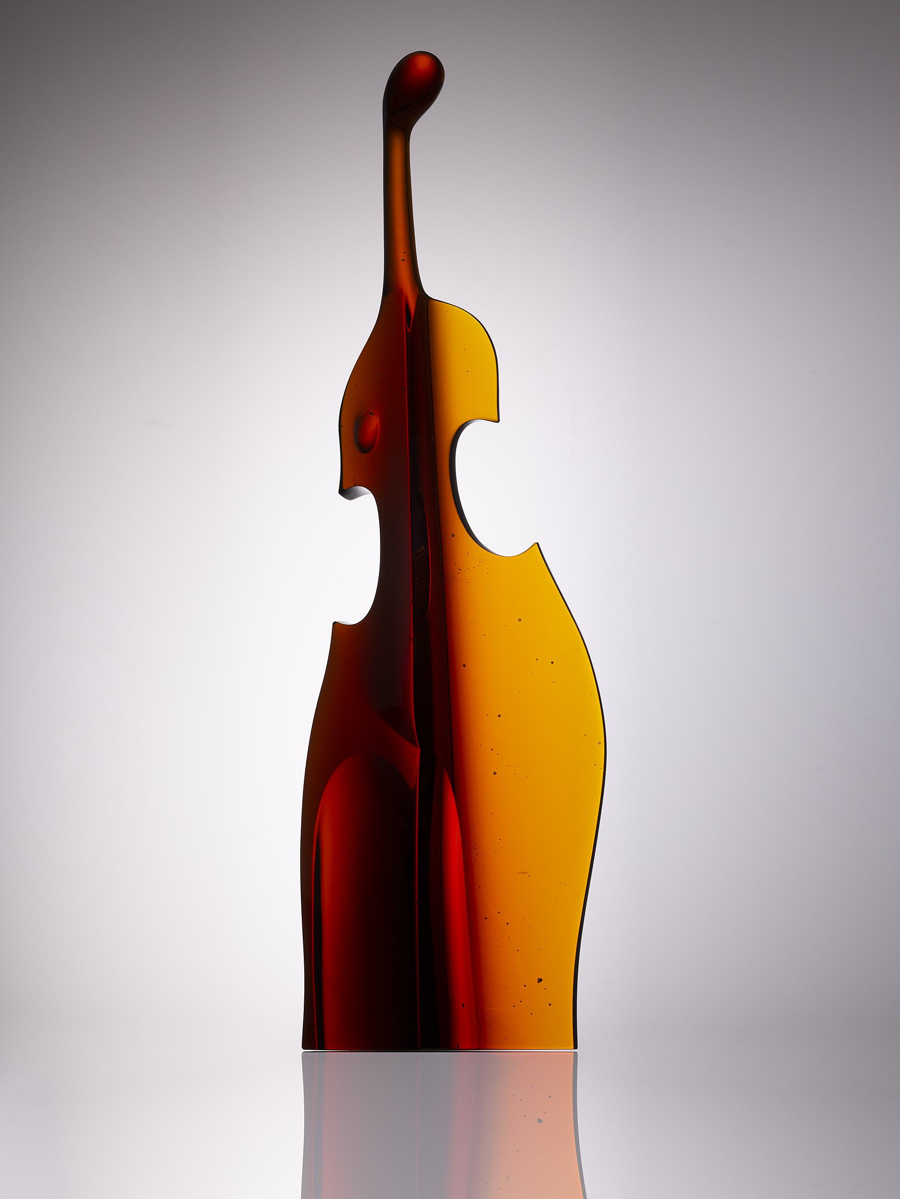 Paní Viola, rok 2025, tavený křišťál, broušený a leštěný, signováno Z. Kunst, celkové rozmě-ry 43 x 14 x 7 cm. Slova autora: Pro mě toto dílo představuje prolnutí hudby v p