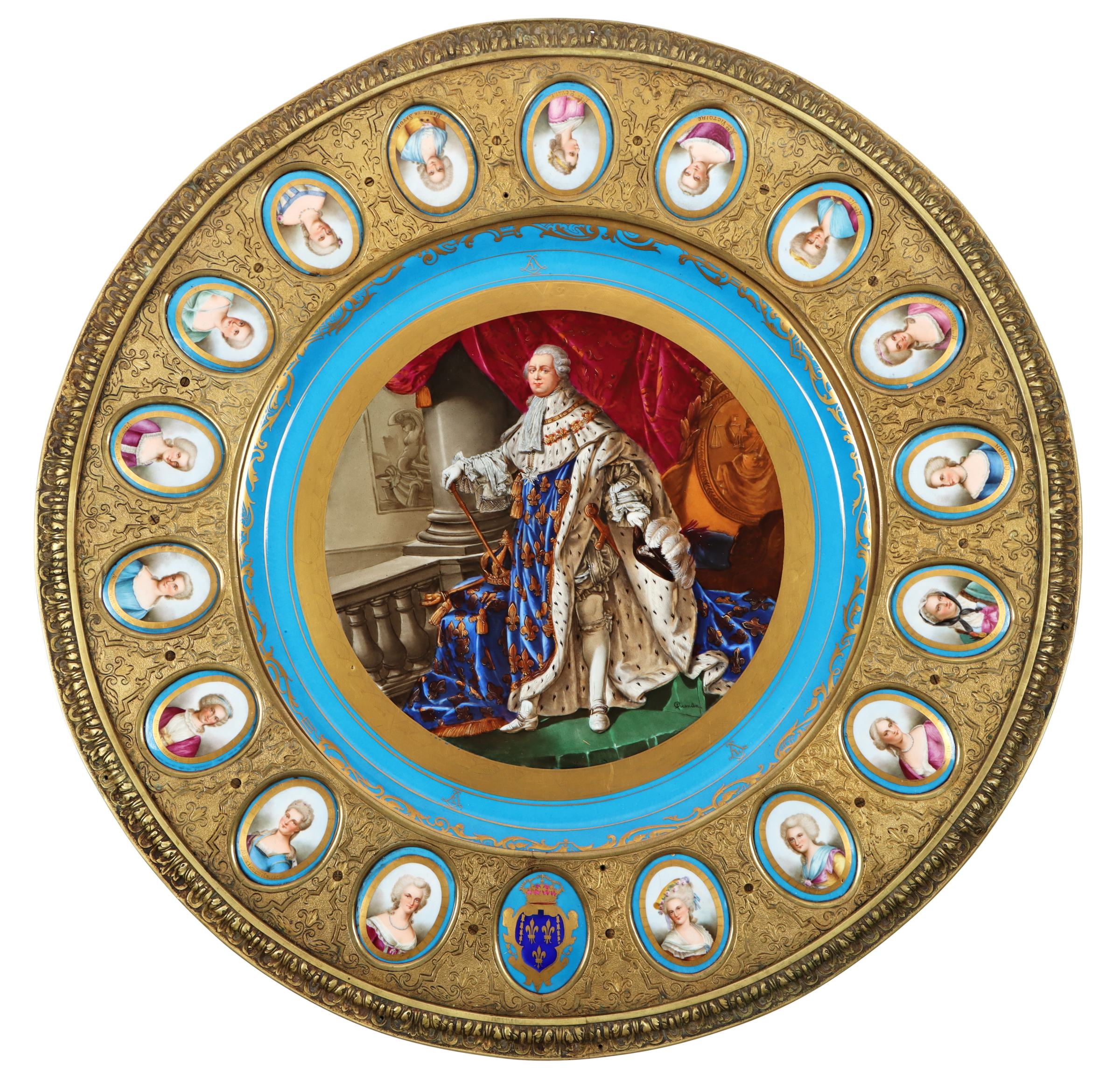 The perimeter is further enriched with a series of 18 oval porcelain miniatures, 17 of which depict portraits of royal ladies-in-waiting, while one miniature is adorned with a heraldic motif featuring fleurs-de-lys, reinforcing the representative monarchical iconography of the ensemble.