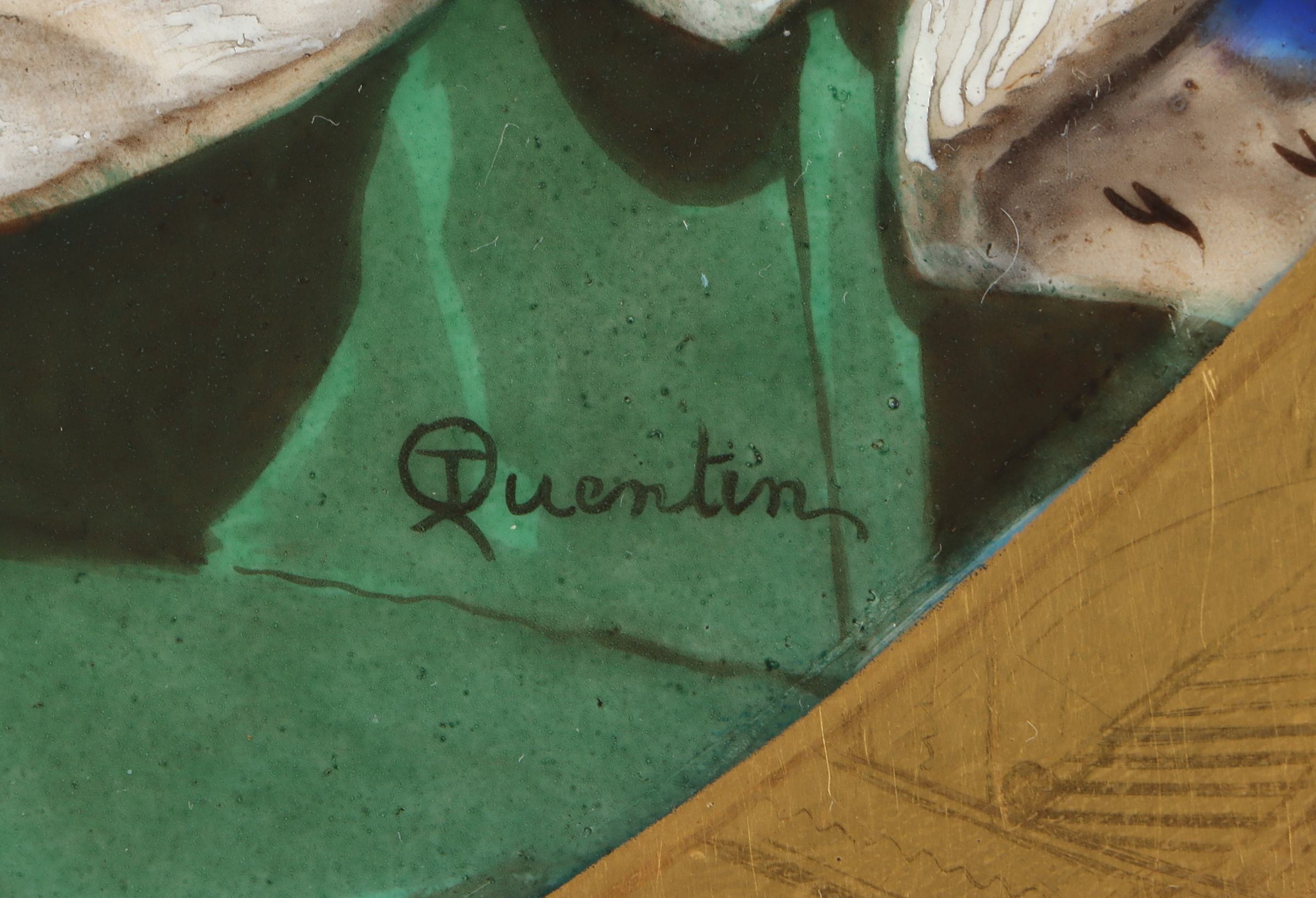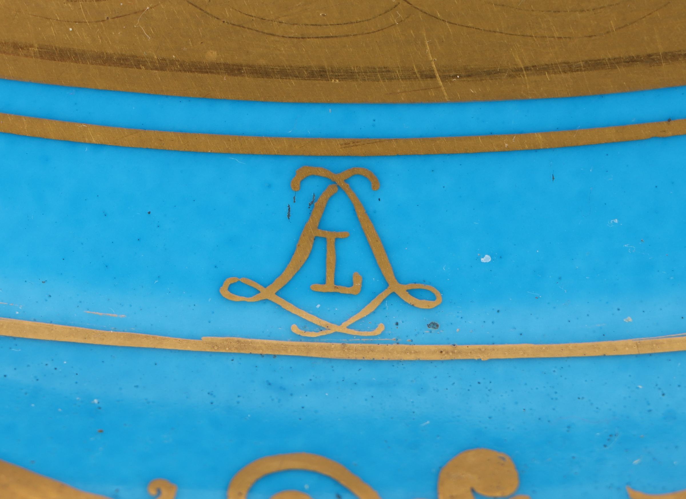 France, second half of the 19th century. The salon table with a circular top is conceived as a central pictorial field featuring a large-format porcelain plaque decorated with a portrait painting of the French king Louis XV in coronation robes with an ermine mantle and regalia. Surrounding the central motif runs a wide band of turquoise-blue ground with gilded ornamentation and three painted Sèvres marks; the painting is signed T. Quentin.