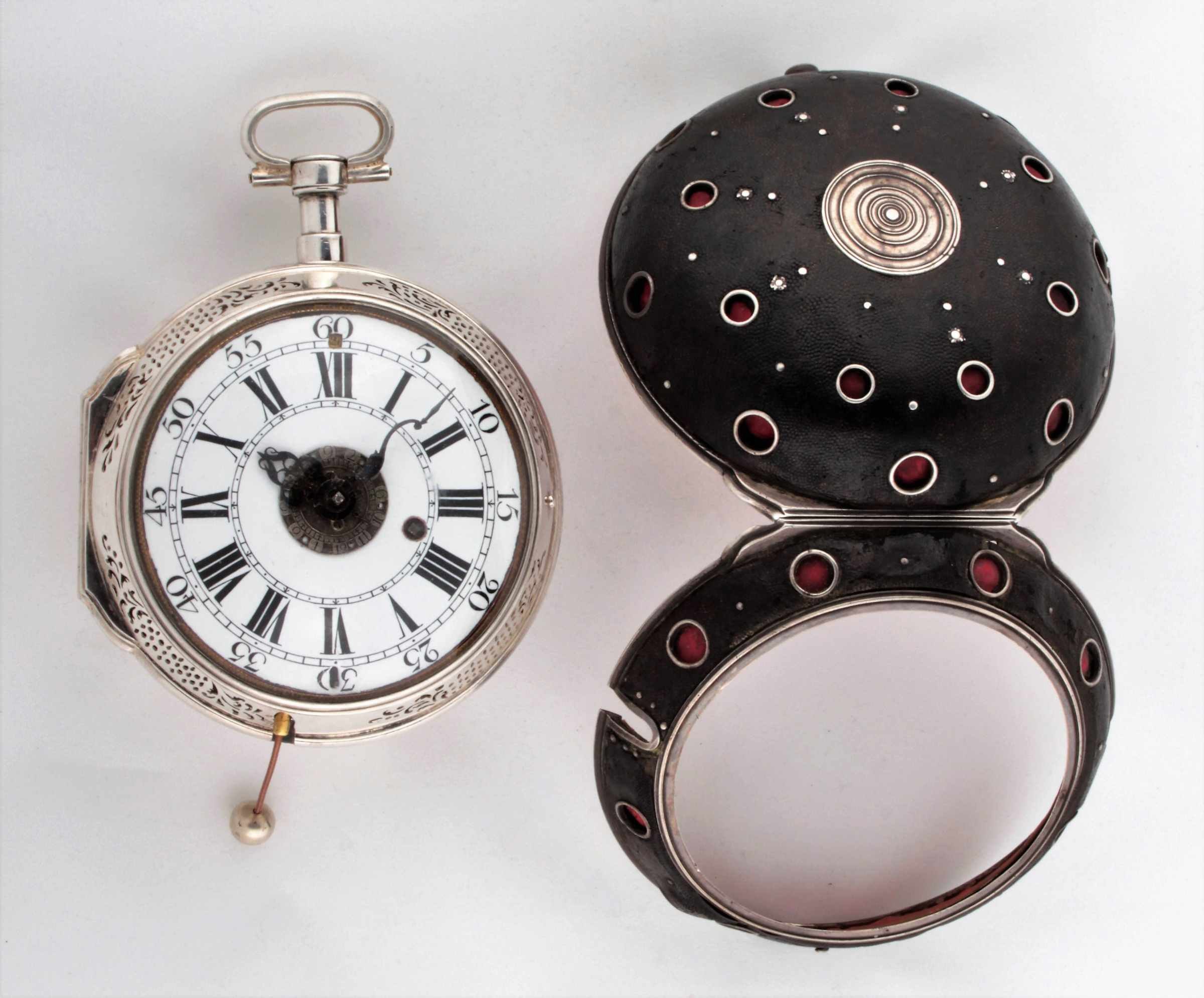 Germany, Friedberg, Joseph Spiegel (Joseph Miroir), circa 1740. Large double-cased traveling striking clock with date display and alarm. The outer silver case is decorated with pierced circular openings, studs, and covered with dark brown snakeskin. The inner silver case is engraved and richly pierced with foliate scroll ornament. Verge movement with circular plates and four turned pillars; mainspring with fusee and compensating chain. The rear of the lower plate and the balance cock are richly relief-decorated and engraved. The movement is signed Jos. Miroir Paris. Quarter-repeating striking mechanism striking on a bell housed in the rear of the case. Enamel dial with Roman numerals for the hours and Arabic numerals for the minutes; digital date aperture above XII; centrally placed small silver subsidiary dial for setting the alarm. Original richly pierced steel hands. Total weight 1,210 g. Overall dimensions 15 × 12 × 8 cm.