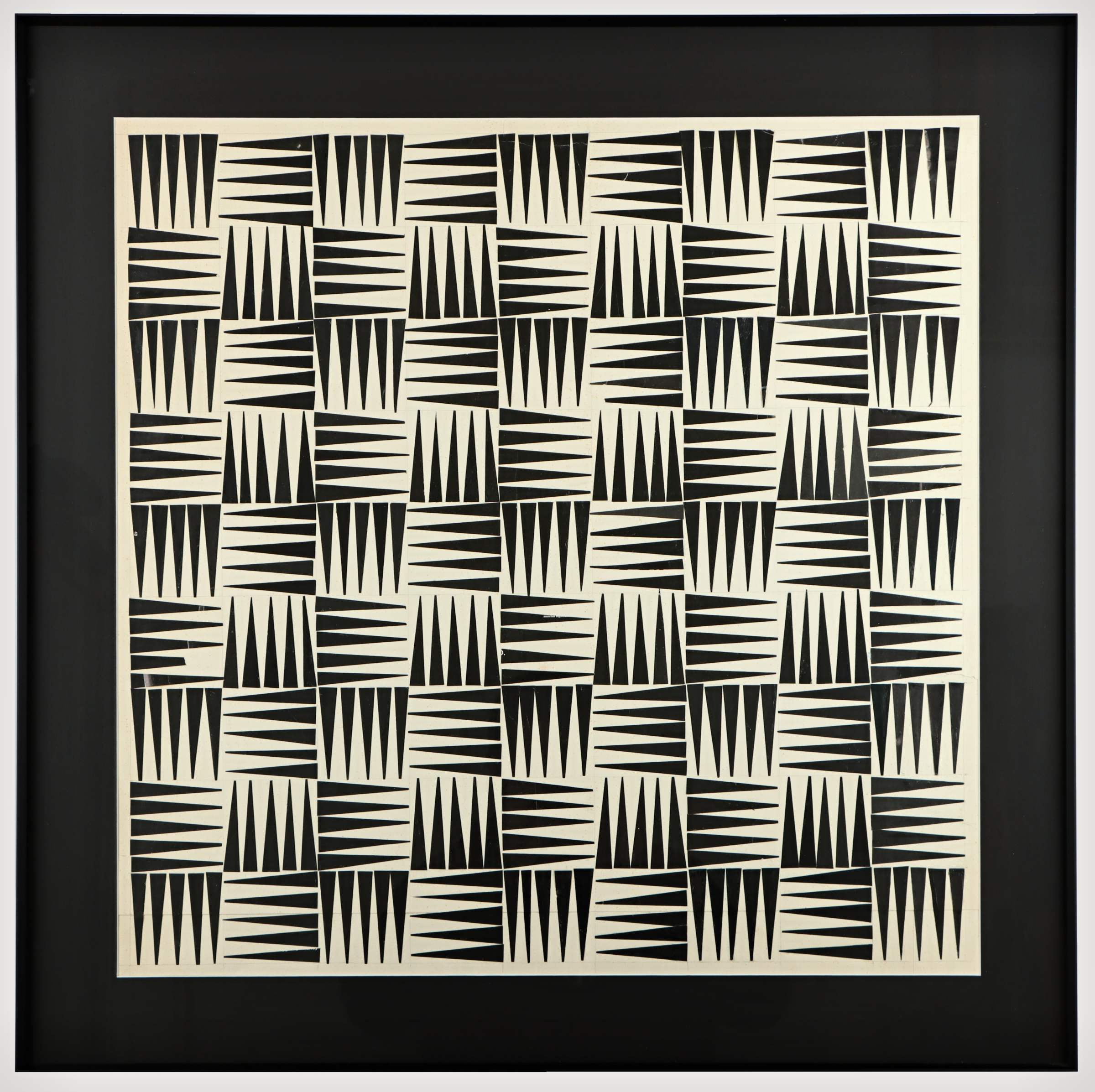Černo-bílá struktura, 60. léta 20. století, kresba - tuš na papíře, značeno razítkem R. Kratina, 50 x 34 cm, celkové rozměry s rámem 65,5 x 48,5 cm. Vystaveno: OKOUZLENI GEOMETRIÍ, Výstavní sí