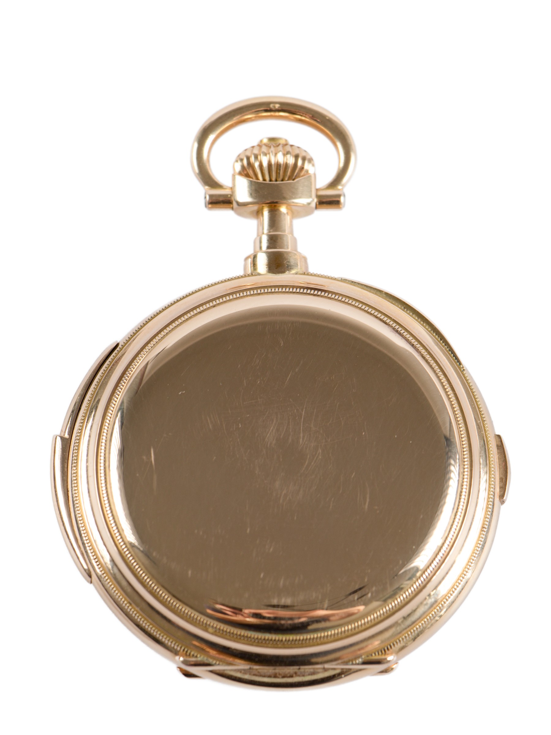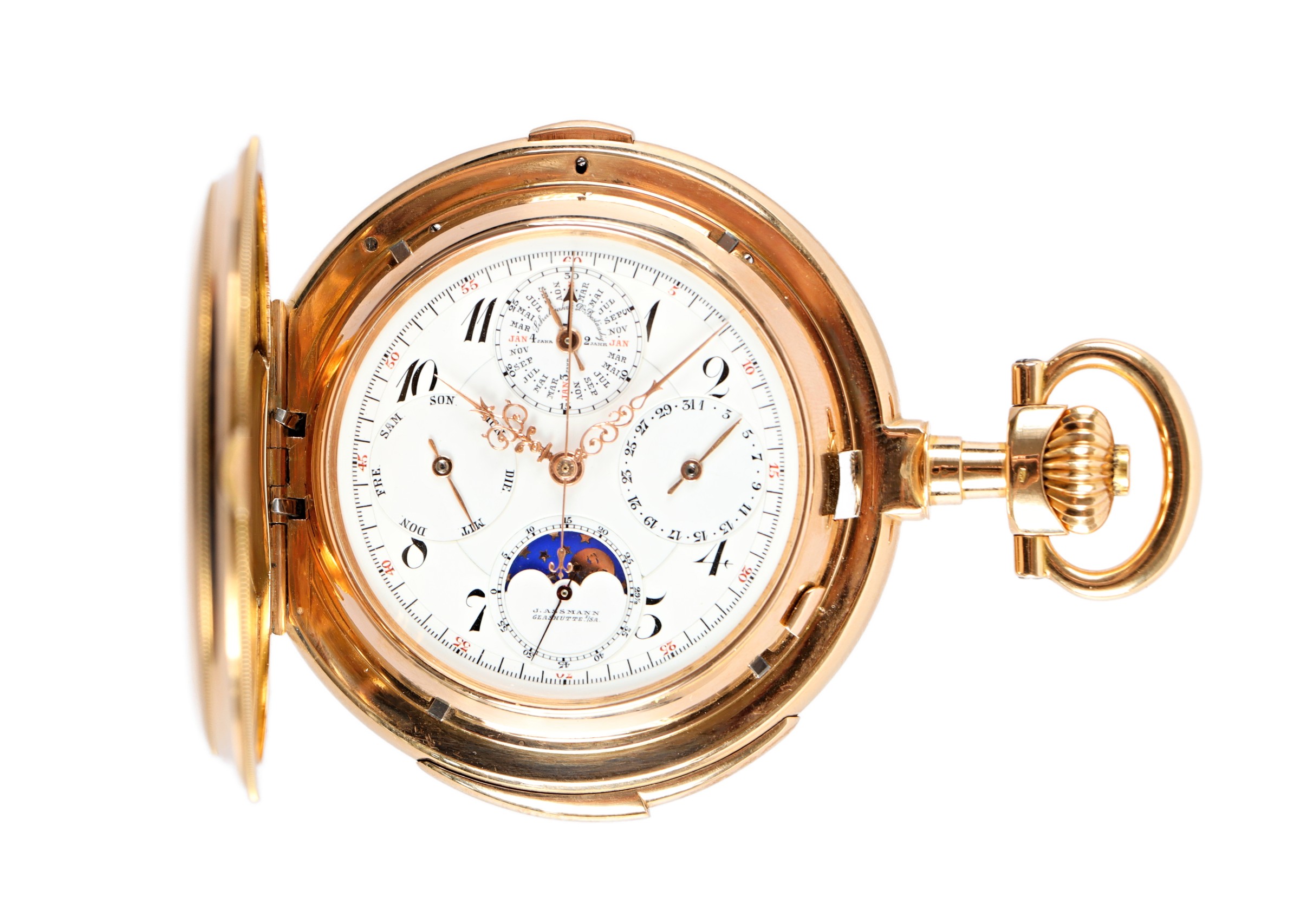 Německo, Sasko, Glashütte, Julius Assmann, okolo roku 1906, extrémně vzácné a mimořádně sběratelsky zajímavé kapesní hodinky s opakovacím minutovým bitím, kalendáriem a chronografem, raritní a extrémně masivní provedení tříplášťového pouzdra vyrobeného z 18-ti karátového zlata, značeno J. Assmann Glashütte, číslo 16953, bílý emailový číselník s arabskými číslicemi pro zobrazená hodin a minut, excentricky umístěné čtyři malé číselníky, nahoře s ukazatelem měsíce v roce - registr na 4 roky, vlevo umístěný číselník pro zobrazení dne v týdnu a vpravo pro zobrazení dne v měsíci, dole umístěný sekundový číselník s výřezem pro kotoučový ukazatel lunárních fází, chronograf s 30 minutovým sčítačem, číselník signovaný J. Assmann Glashütte I/SA., stroj s kotvovým krokem, signovaný J. Assmann Glashütte Sachsen No. 16953, zlatá kotva a stoupací kolo, mikroregulace, bimetalická kompenzační setrvačka, hřídele uložené v kamenech, šroubované šatony, minutový opakovací bicí mechanismus odbíjí do spirálového gongu, přiložena etue značená J. Assmann Deutche Anker – Uhnen – Fabrik Glashütte i/S., certifikát, celková hmotnost hodinek cca 220 g, výška s ouškem 86,8 mm, průměr 60 mm, tloušťka 18,5 mm.
