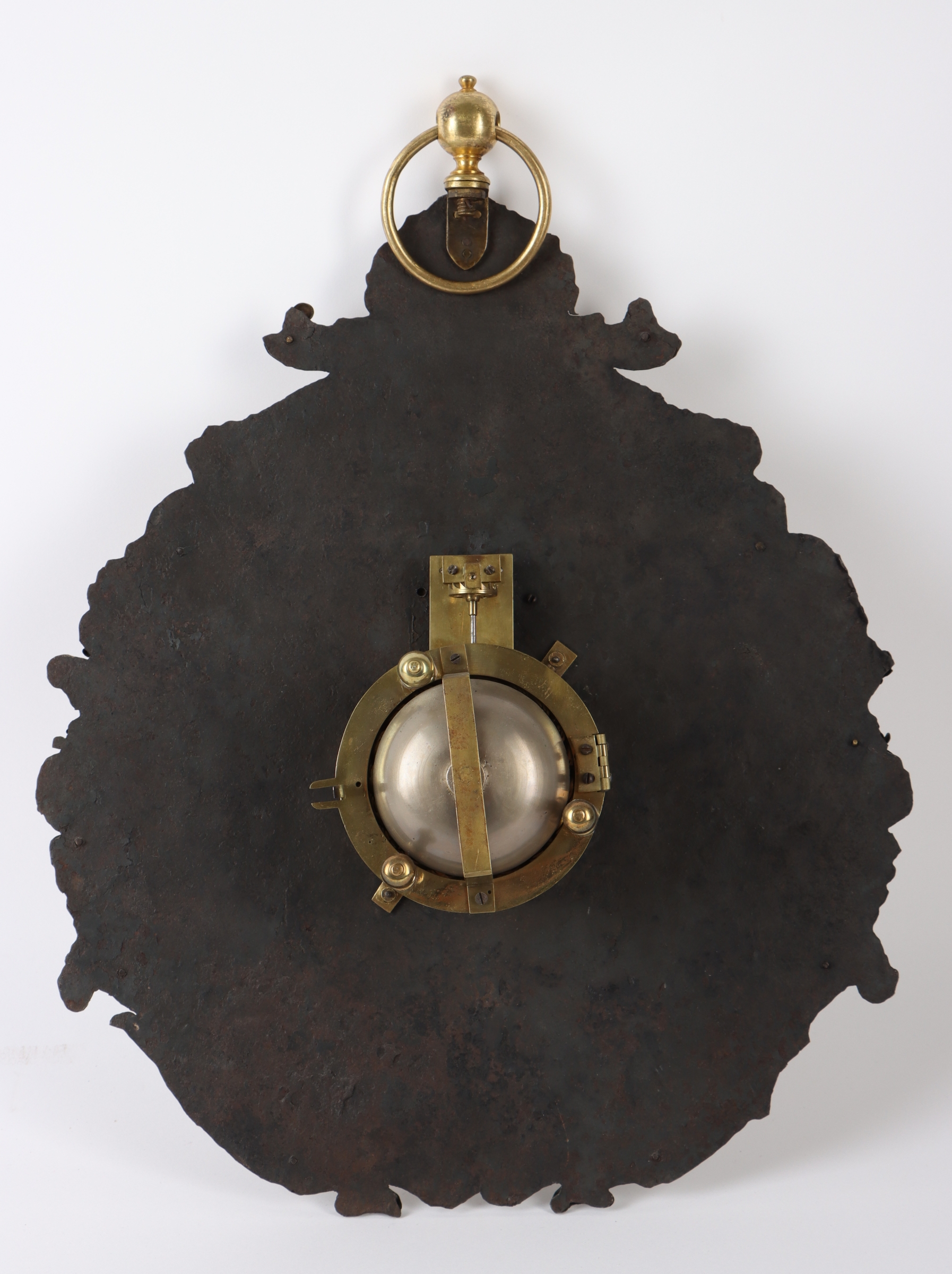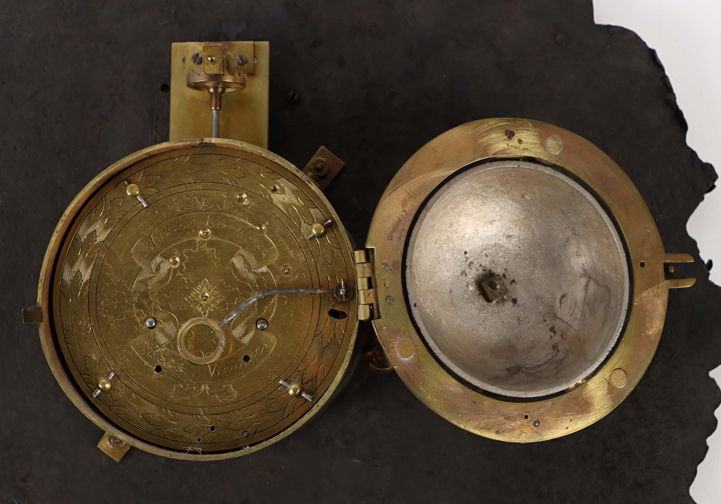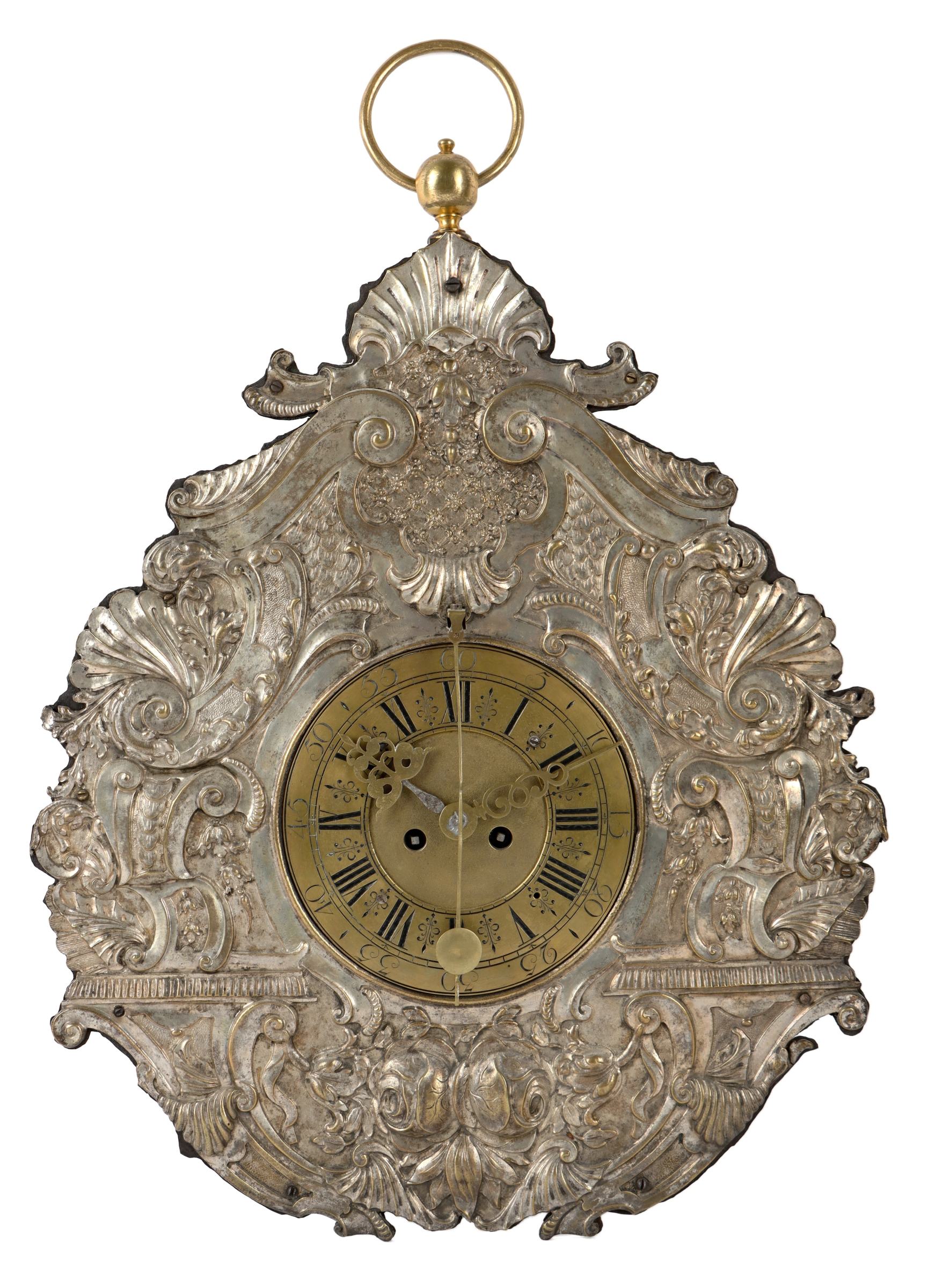 Rakousko, Vídeň, počátek 18. století, velké nástěnné talířové hodiny, kovaná železná číselníková deska osazena stříbřeným mosazným plechem s bohatou reliéfní výzdobou, mosazný číselník s římskými číslicemi a minutovým dělením s arabskými číslicemi, jící stroj s pérovým pohonem a bicím mechanismem, který odbíjí celé hodiny do kovového zvonku, vřetenový krok s kyvadlovým oscilátorem umístěným před číselníkem, oscilátor pevně spojen s paletovým hřídelem, prořezávané ručičky z mosazi a oceli, zadní základna stroje zdobena rytinou a opatřena signaturou Mathias Kerkhamer Fecit Vienna, stroj osazen v mosazném pouzdře se třemi soustruženými nožičkami, celkové rozměry hodin 54 x 38 x 10 cm.