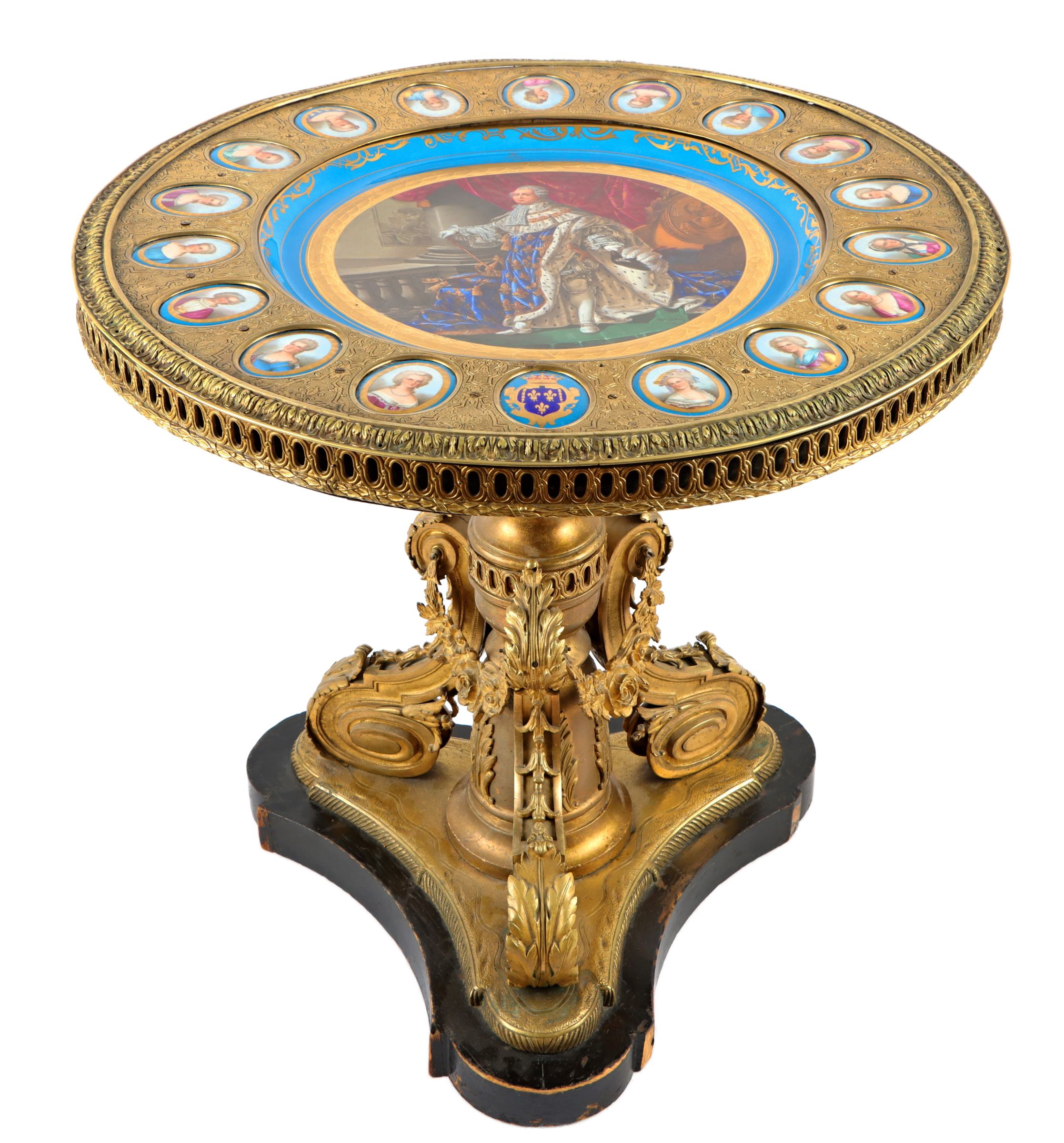 France, second half of the 19th century. The salon table with a circular top is conceived as a central pictorial field featuring a large-format porcelain plaque decorated with a portrait painting of the French king Louis XV in coronation robes with an ermine mantle and regalia. Surrounding the central motif runs a wide band of turquoise-blue ground with gilded ornamentation and three painted Sèvres marks; the painting is signed T. Quentin.