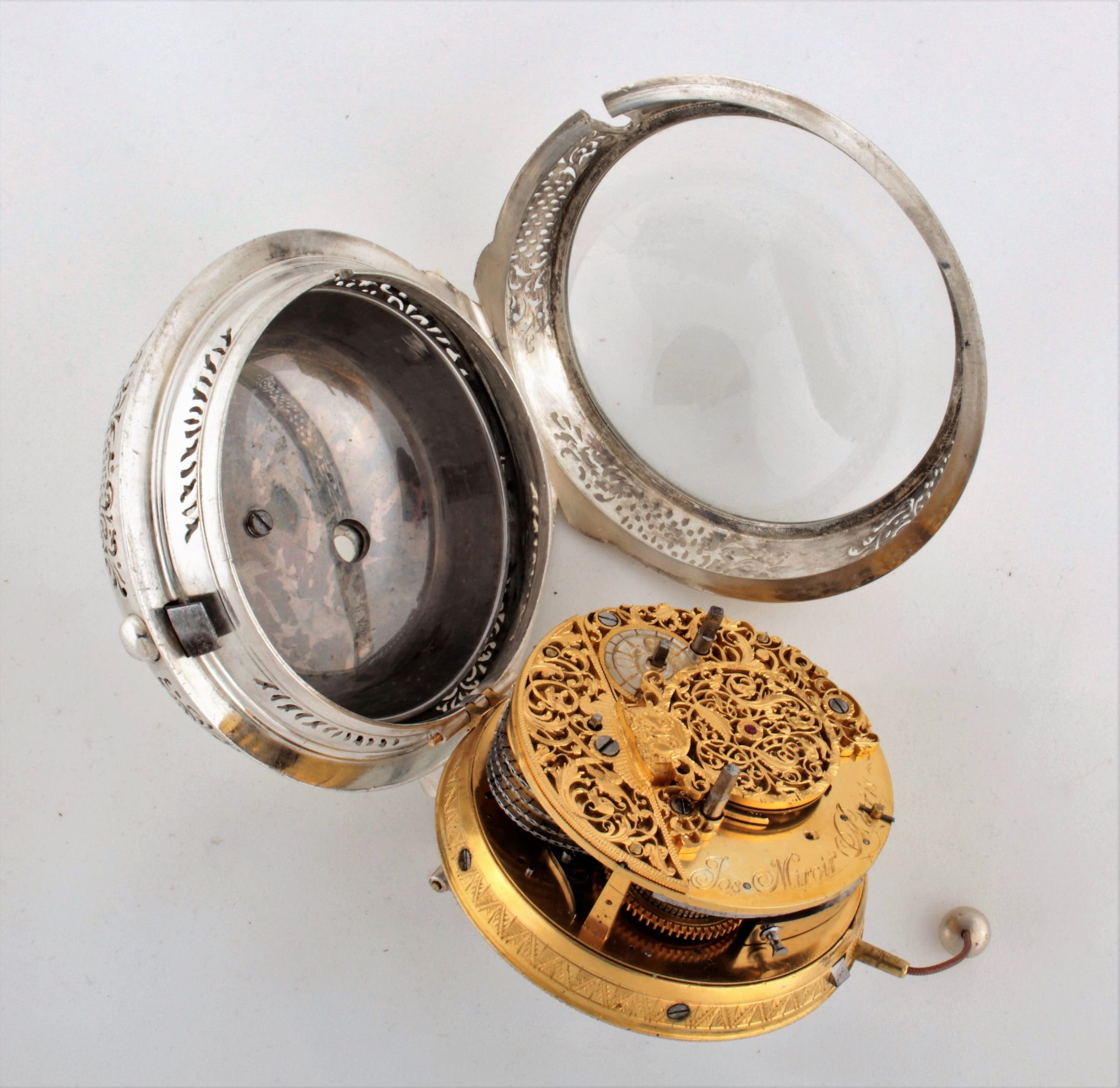 Germany, Friedberg, Joseph Spiegel (Joseph Miroir), circa 1740. Large double-cased traveling striking clock with date display and alarm. The outer silver case is decorated with pierced circular openings, studs, and covered with dark brown snakeskin. The inner silver case is engraved and richly pierced with foliate scroll ornament. Verge movement with circular plates and four turned pillars; mainspring with fusee and compensating chain. The rear of the lower plate and the balance cock are richly relief-decorated and engraved. The movement is signed Jos. Miroir Paris. Quarter-repeating striking mechanism striking on a bell housed in the rear of the case. Enamel dial with Roman numerals for the hours and Arabic numerals for the minutes; digital date aperture above XII; centrally placed small silver subsidiary dial for setting the alarm. Original richly pierced steel hands. Total weight 1,210 g. Overall dimensions 15 × 12 × 8 cm.