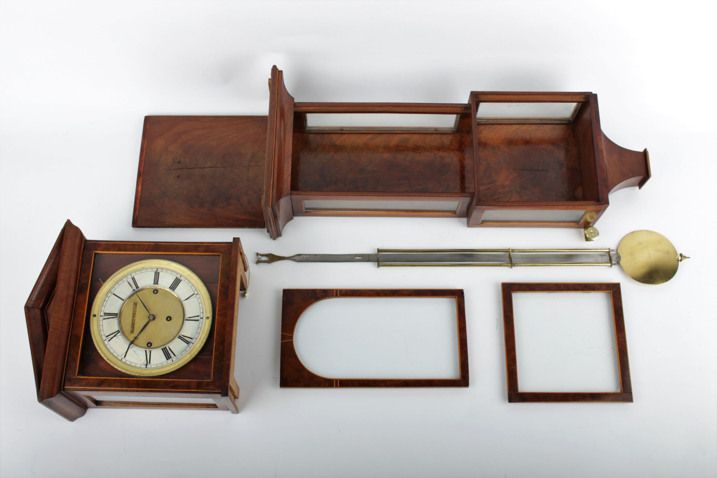 Wall-mounted pendulum clock, so-called lantern clock, circa 1830, Vienna; dial signed I. Vlaschitz in Wn. Neustadt (Ignatz Vlaschitz in Wien Neustadt). Mahogany veneer with line inlay. Movement in working order; Graham anchor escapement; spring-driven; 1-day duration; quarter striking (4/4) on gongs; metal dial with gilded central chapter ring and silvered outer ring with Roman numerals I–XII; blued steel hands; gilt brass bezel. Gridiron pendulum with steel rod and brass bob; knife-edge suspension. Original movement, pendulum, and clock case. Overall dimensions: 82 × 24 × 13 cm.